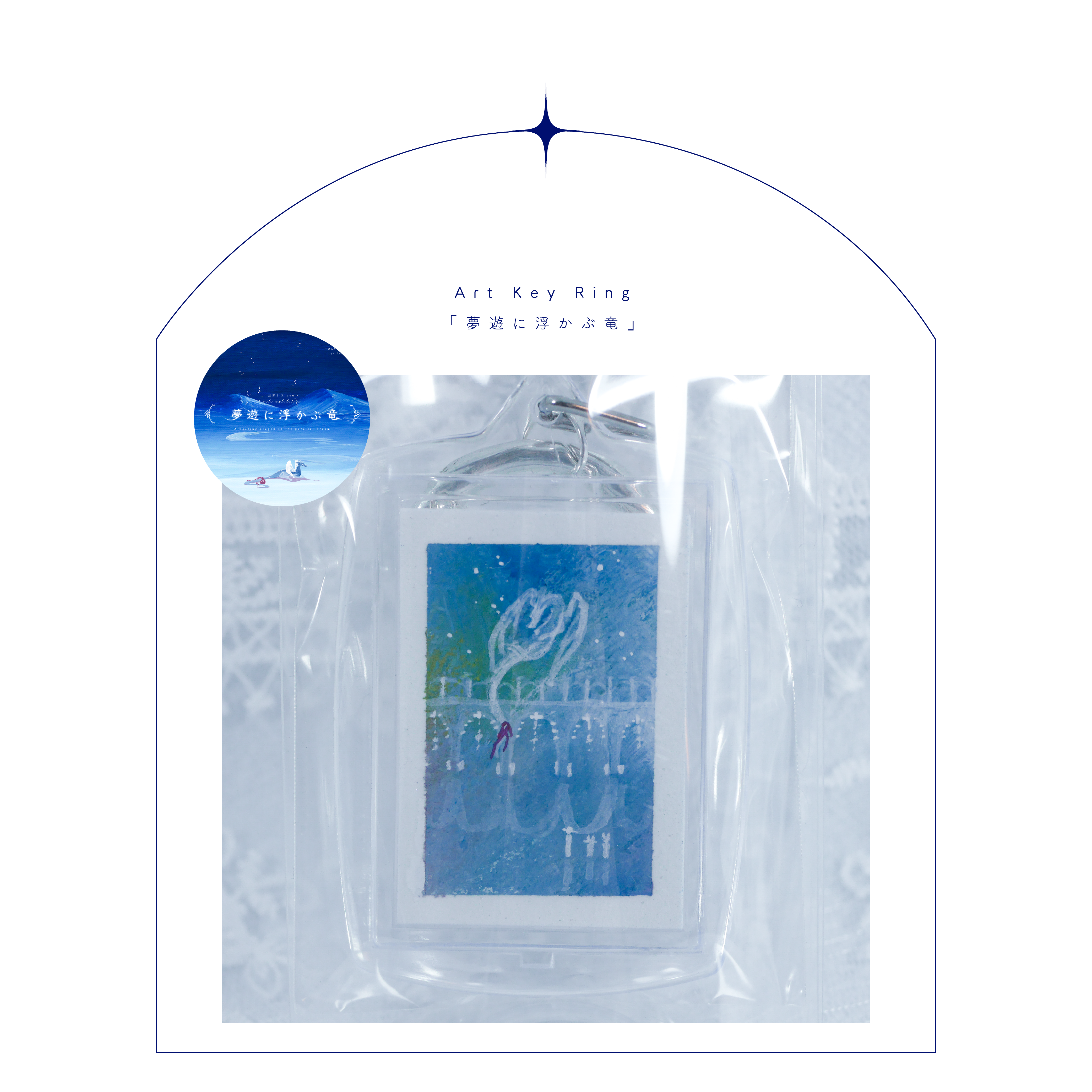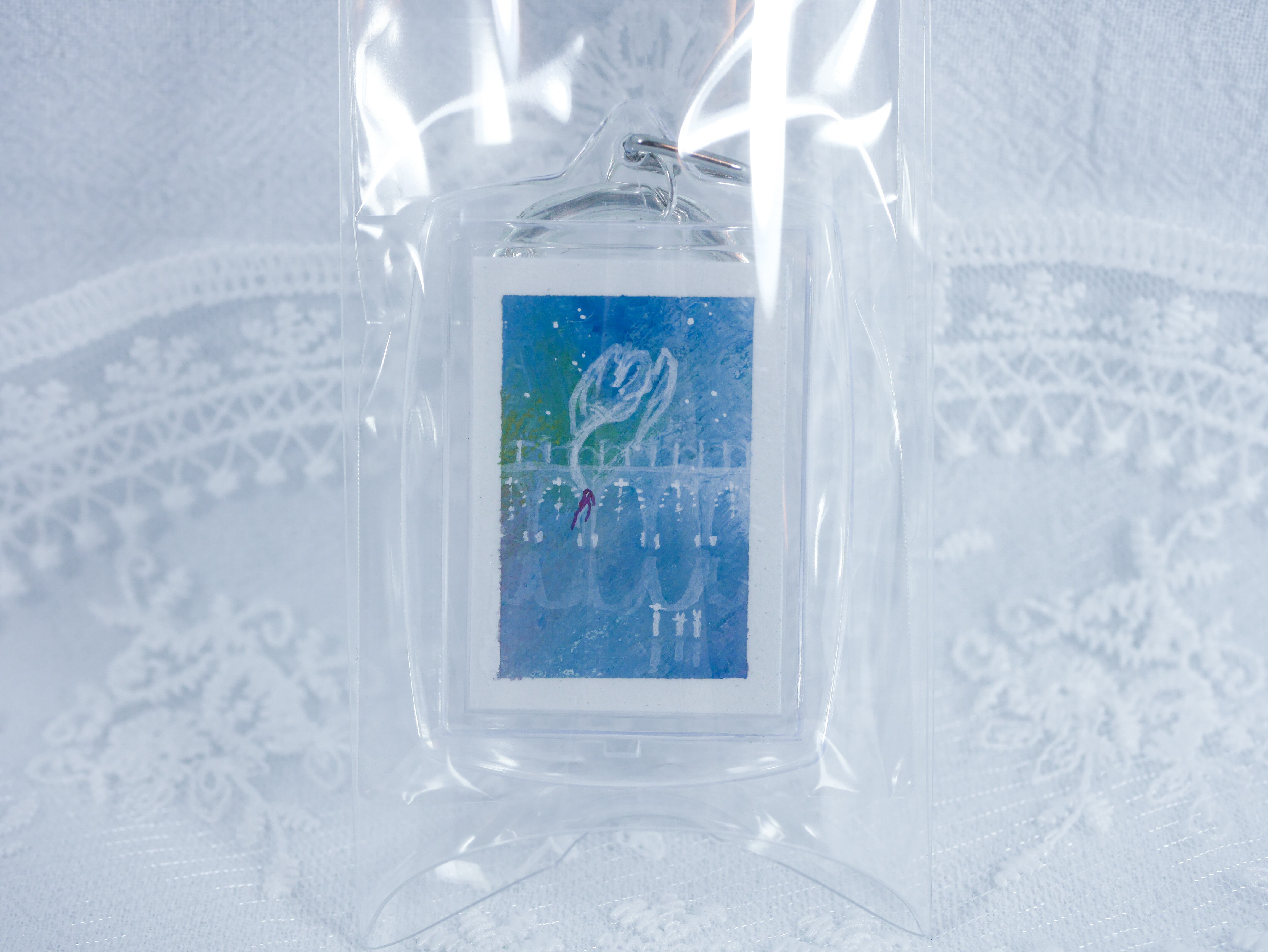 個展「夢遊に浮かぶ竜」にて初制作した小さな原画の入ったキーホルダーです。ラメ水彩紙に描いているので余白部分の煌めきもお楽しみいただけます。