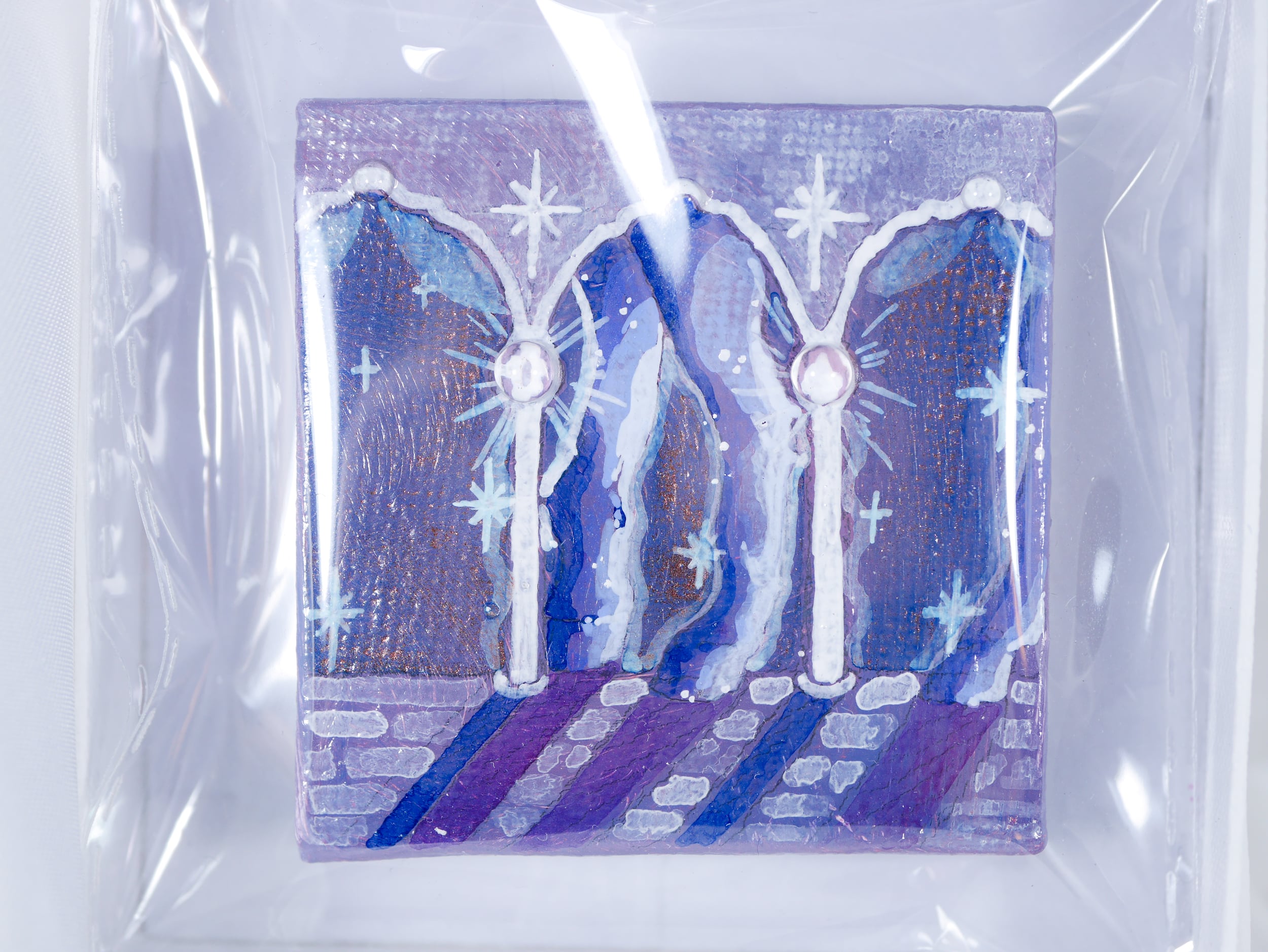 一緒にお届けする白箱に入れたままデスクや棚へ飾ったり、キャンバス裏面の窪みにピンを引っ掛け壁面へ飾ってお楽しみください。そして夢遊世界の一端が素敵な夢を届けますように。