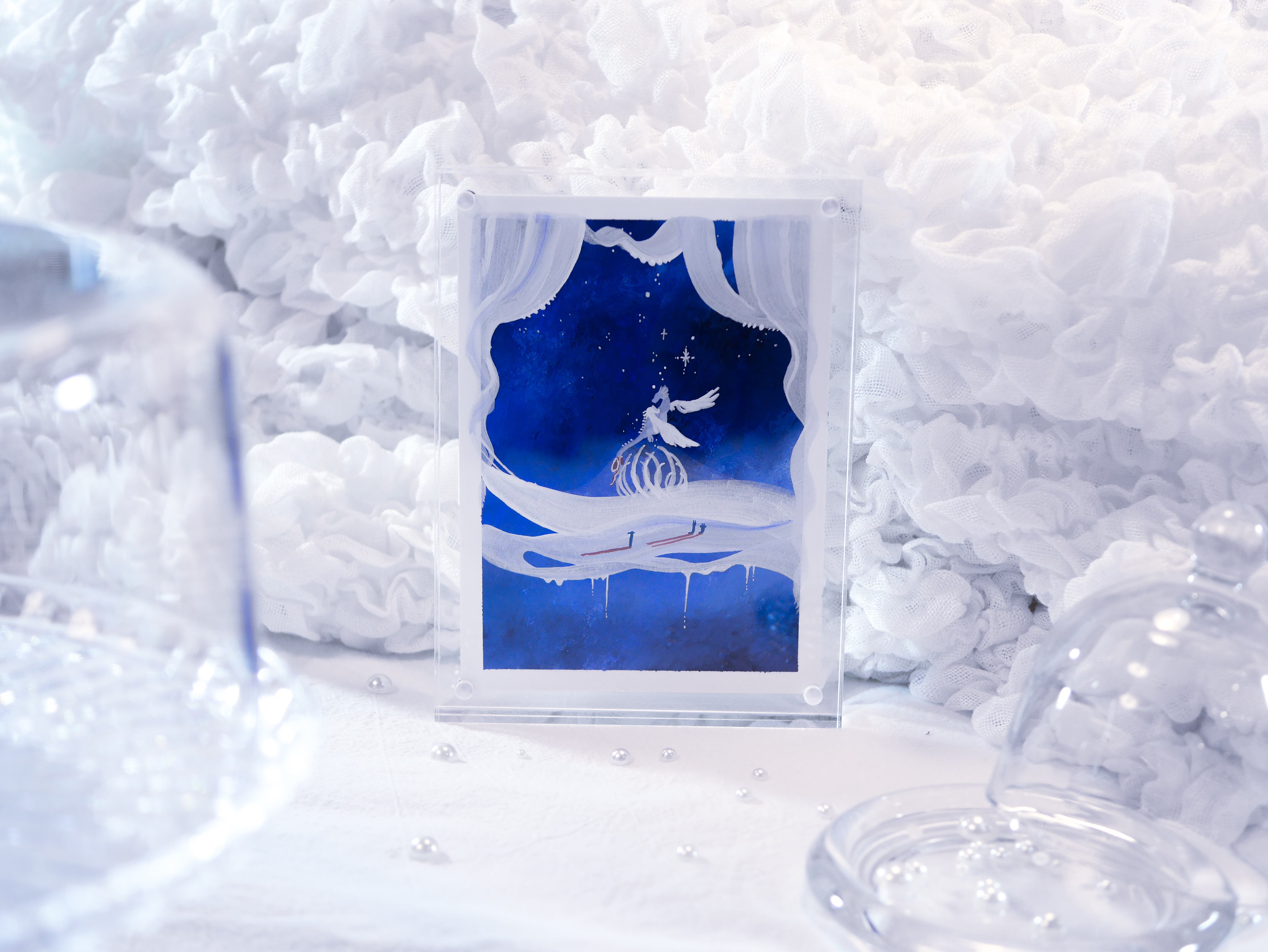 ラメ入りの水彩紙にアクリル絵の具で「Weltraum」(宇宙空間)をテーマに夢遊世界を描きました。こちらは手描きの原画作品となっております。無重の空間を是非お楽しみください。